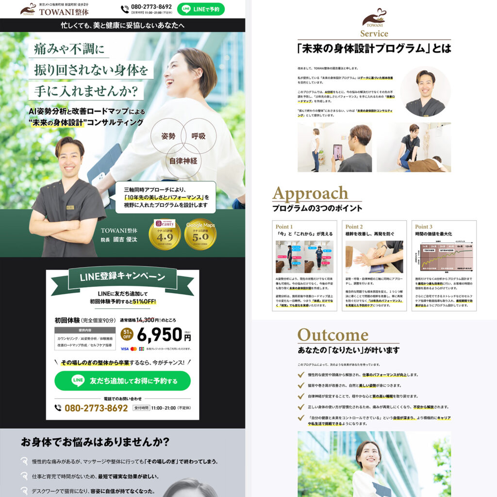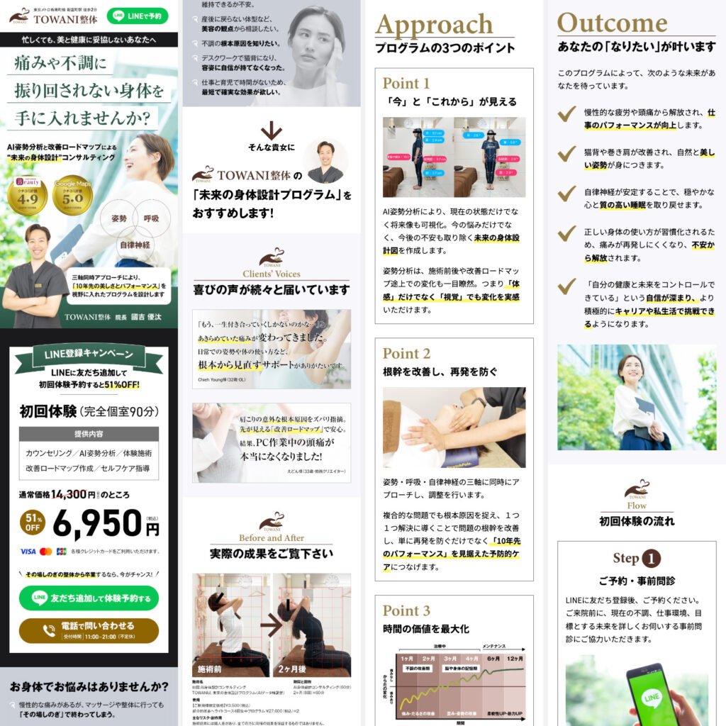 さらに「姿勢」「呼吸」「自律神経」「三軸同時アプローチ」といった裏付けとなる理論をチラ見せし、信頼感と期待を高めます。